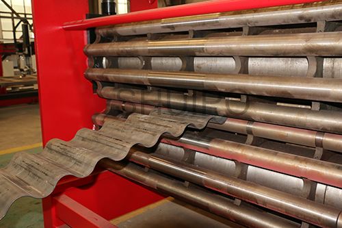 波紋板成型機(jī)主要分為機(jī)架、驅(qū)動(dòng)部分、上壓輪、下壓輪、進(jìn)料導(dǎo)向機(jī)構(gòu)、以及前后工作臺(tái),波紋板自動(dòng)成型機(jī)通過同時(shí)旋轉(zhuǎn)的上、下壓輪,將平板加工成波紋狀,成型效果一致性好,效率高,波紋的高度調(diào)整有電機(jī)驅(qū)動(dòng)。