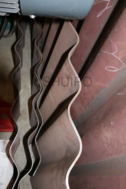 波紋板成型機(jī)主要分為機(jī)架、驅(qū)動(dòng)部分、上壓輪、下壓輪、進(jìn)料導(dǎo)向機(jī)構(gòu)、以及前后工作臺(tái),波紋板成型機(jī)是通過同時(shí)旋轉(zhuǎn)的上、下壓輪,將平板加工成波紋狀,成型效果一致性好,效率高,波紋的高度調(diào)整有電機(jī)驅(qū)動(dòng),通過操作控制箱上的按鈕調(diào)整波紋高度范圍,調(diào)整方便,性能可靠。